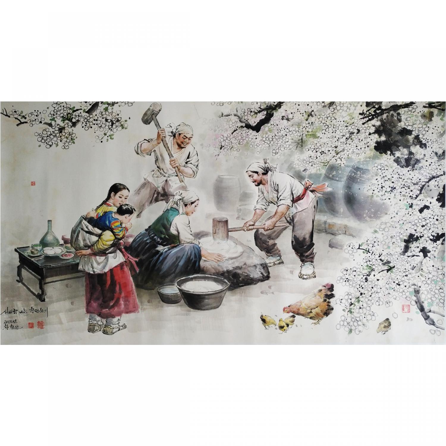 车炯三《欢快的做打糕》朝鲜国画