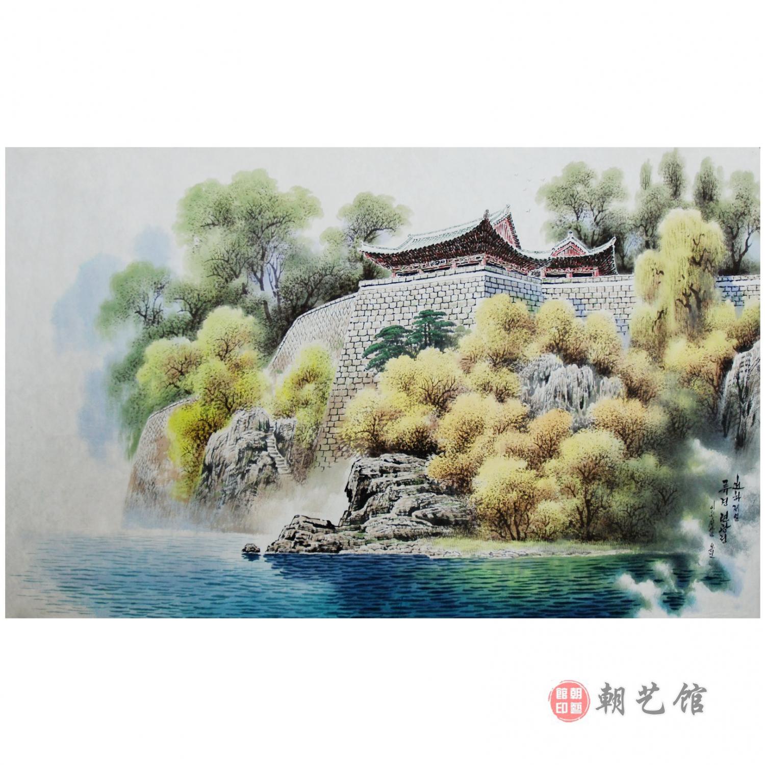 金日国《炼光亭》朝鲜国画佚名《炼光婷》朝鲜国画的市场价值,他的尺寸73X123,年代是2014