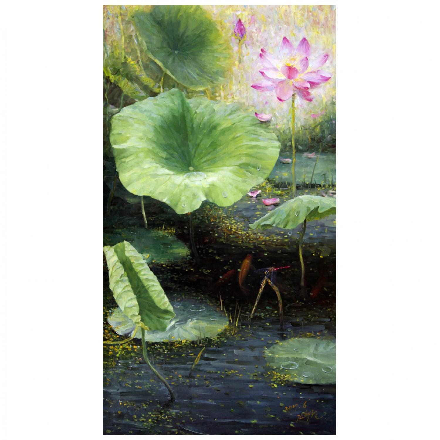 金革哲《塘》朝鲜油画风景金革哲荷塘2017年96x53cm》朝鲜油画风景的市场价值,他的尺寸96X53,年代是2017