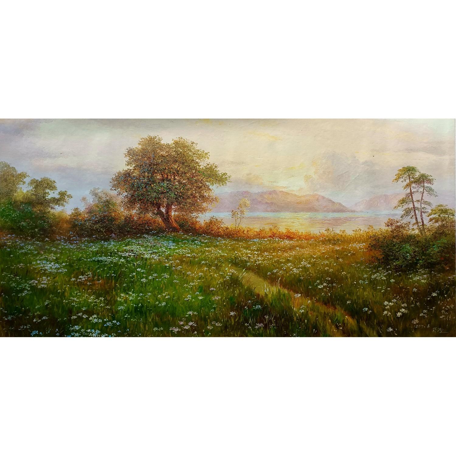 贤哲《故乡》朝鲜油画贤哲《故乡》朝鲜油画的市场价值,他的尺寸75X150,年代是2017